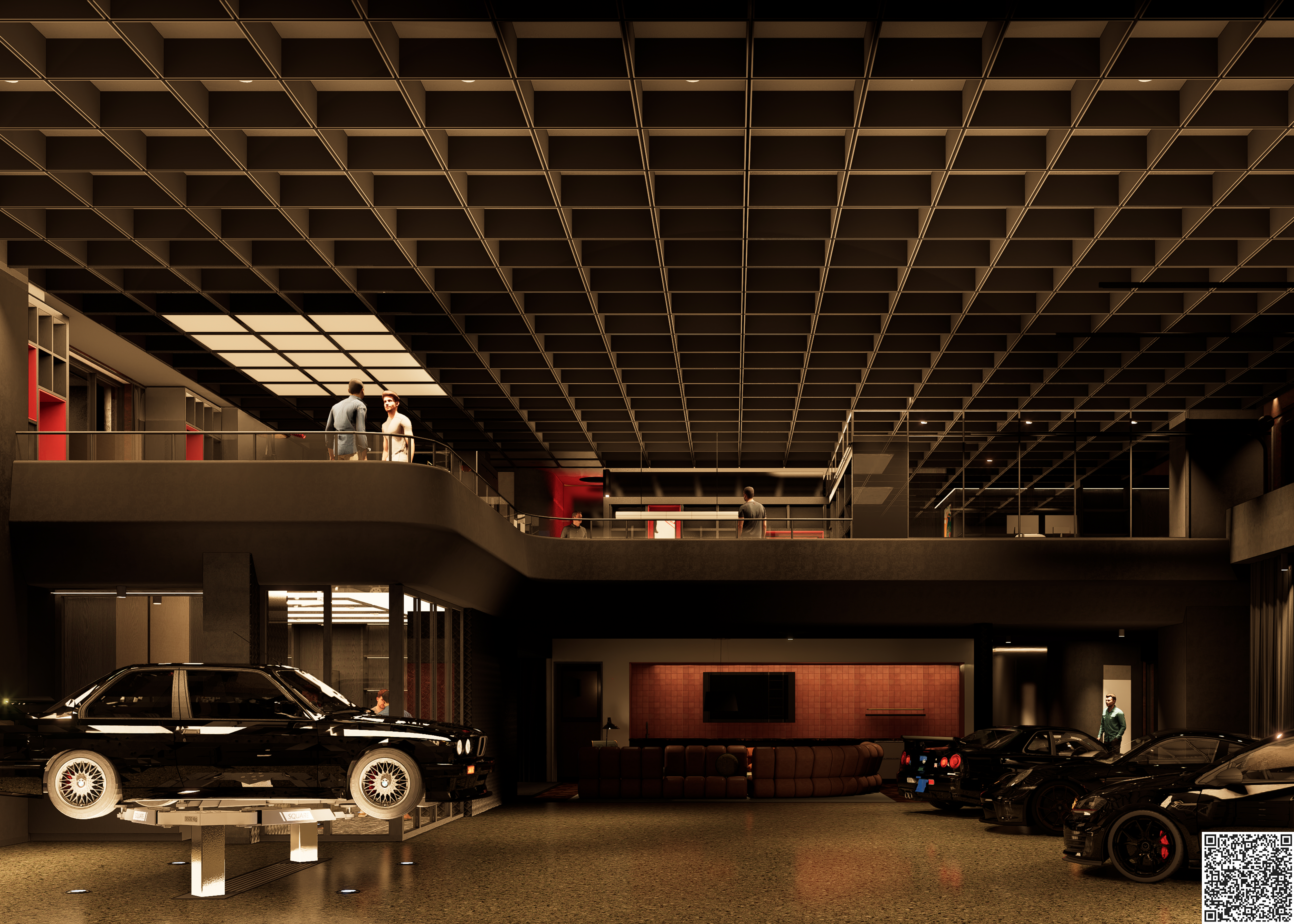 The design blends Blade Runner-inspired cinematic flair, vintage European cars, and anime influences, creating a space that’s bold, precise, and immersive. Highlights include a mechanic zone, enclosed woodshop, dedicated library, two lounges, and premium finishes like acoustic ceilings and custom millwork.